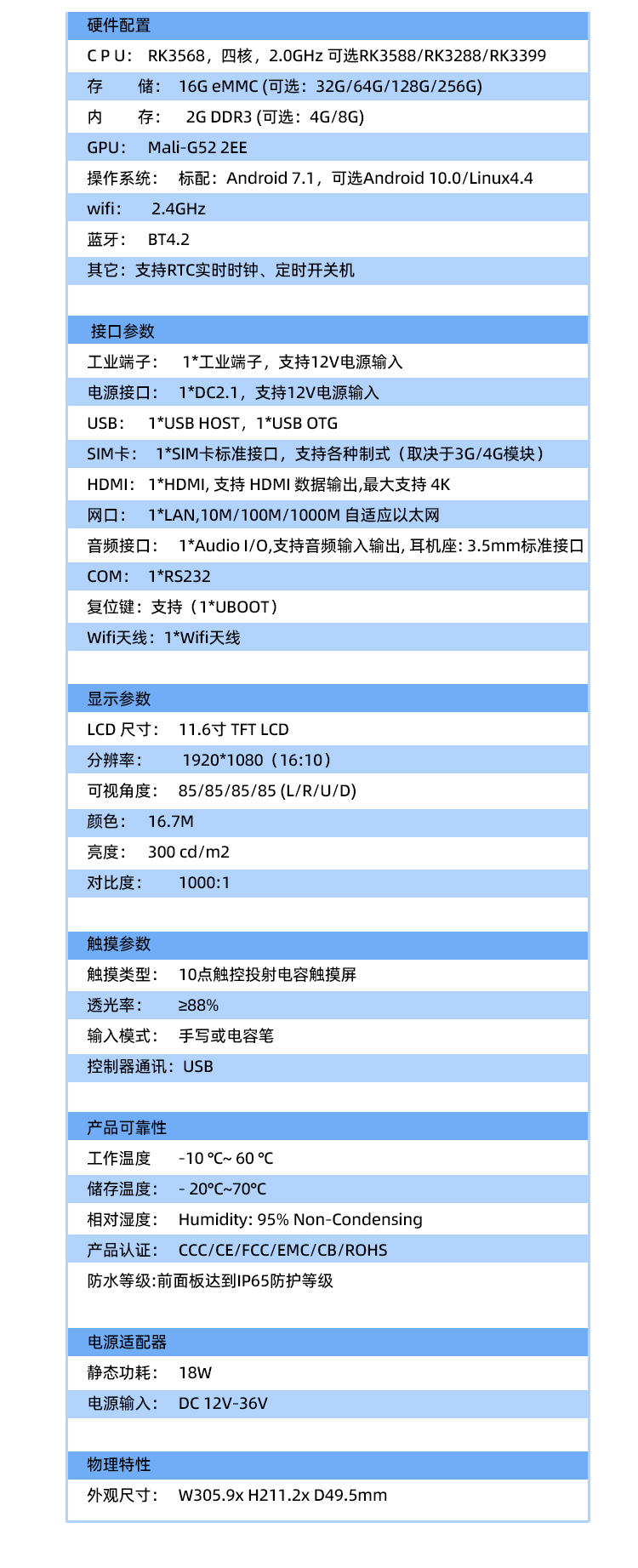 11.6寸工業一體機ARM平臺RK3568純平低功耗防塵防水