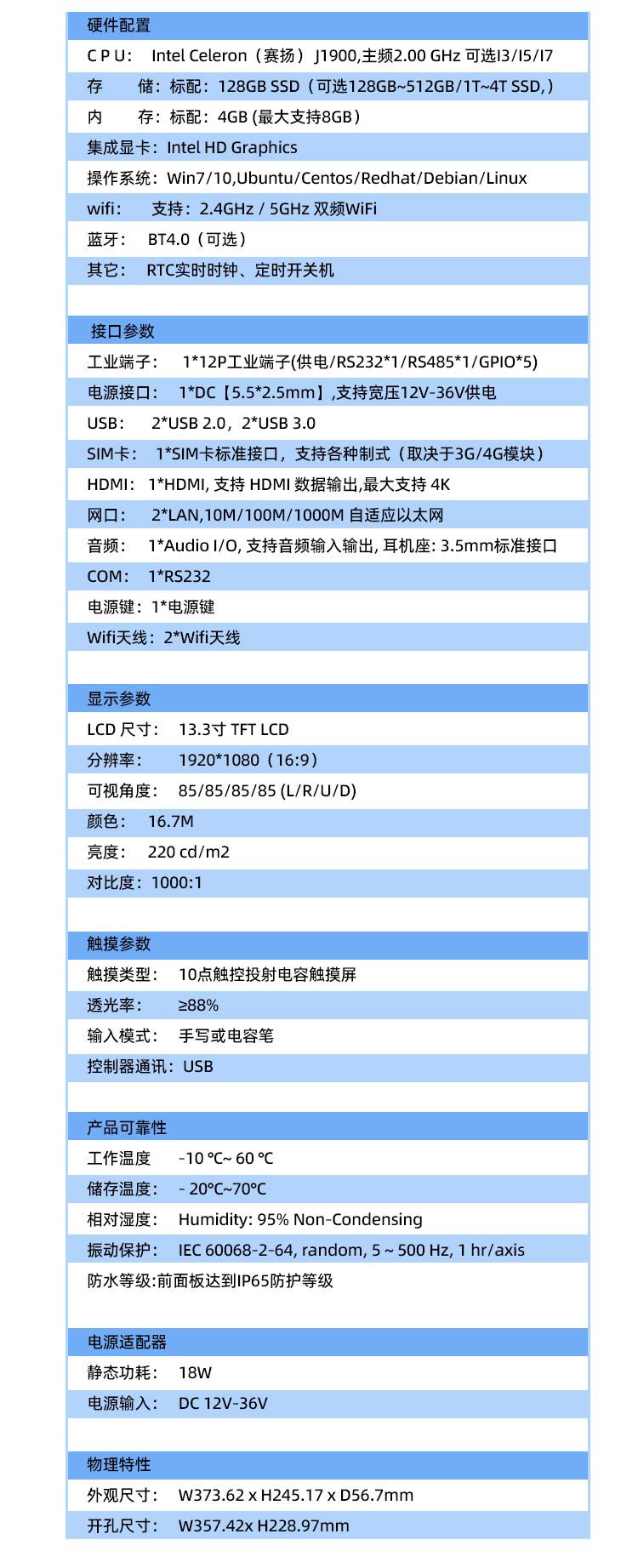 13.3寸工業一體機X86架構J1900防水防塵純平前面框支持二次開發